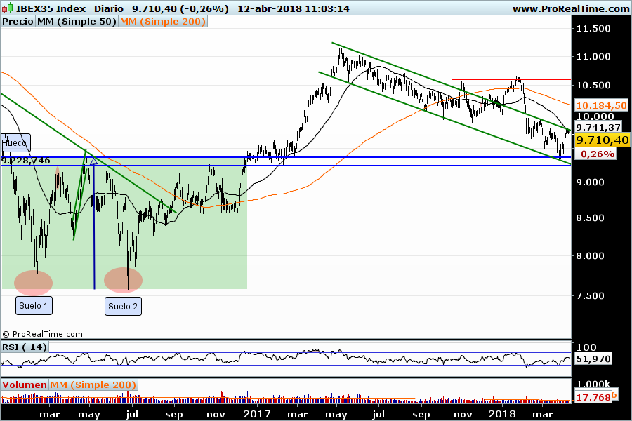 El Ibex 35 cae un 15 % desde máximos y sigue siendo alcista en tendencia. Es pronto para hablar de un gran pullback al punto donde se confirmaba el gran doble suelo que propició un gran movimiento alcista para el Ibex 35 en la primera parte de 2017, pero desde luego es una posibilidad que está sobre el tablero.