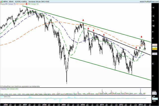 Ahora el gráfico de BBVA, en la parte superior el semanal y en la inferior el diario, se trata de gráficos ya ajustados por el dividendo opción de hoy, en ellos se aprecia el fracaso alcista contra la línea de tendencia bajista con origen en 2007 y como el BBVA intenta aferrarse con uñas y dientes al soporte clave de 6,45/6,50 euros para tratar de reordenarse al alza; no se trata de una tarea sencilla sobre todo si el Ibex acaba por perder la media móvil de 200 sesiones y mas teniendo en cuenta que el resto de valores del sector bancario se han llevado todos por delante soportes similares, técnicamente BBVA es un islote aislado dentro de su sector.