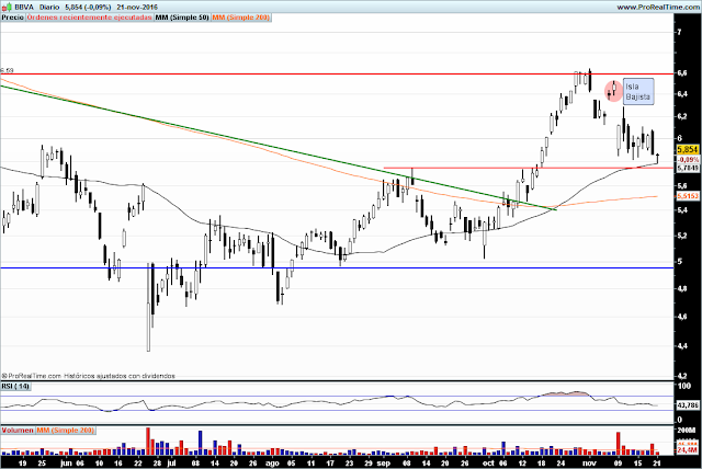Si nos fijamos en el gráfico de BBVA observamos como la caída le ha llevado por ahora hasta su primera zona de soporte relevante, los 5,75 - 5,80 euros a los que cotiza coinciden con el penúltimo máximo relativo y la Media Móvil de 50 sesiones, por tanto estamos ante un soporte importante que podría propiciar al menos un rebote en el valor tras corregir el 50 % del tramo alcista desde 5 a 6,70 euros, siendo esta última la resistencia clave de medio plazo.